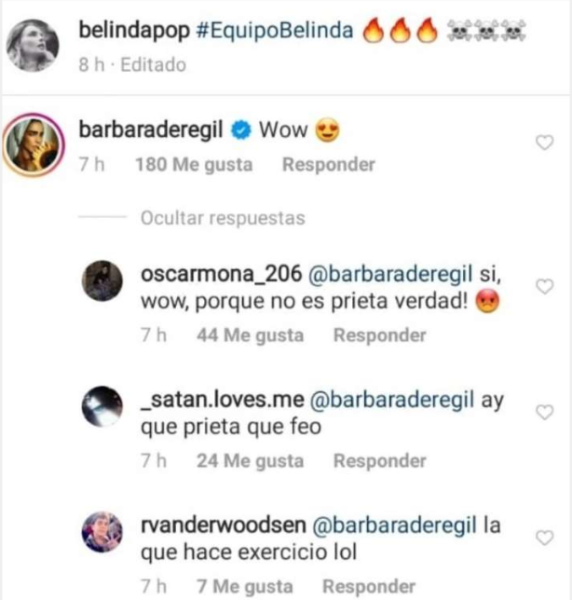 Los fans comenzaron a criticar a la intérprete de Rosario Tijeras, algunos de ellos le mencionaron que la única razón por la que comentaba la foto de Belinda era porque la cantante no era morena, hay que recordar que hace unos días Bárbara de Regil fue criticada por mencionar que lucía “prieta” con un filtro de Instagram, algo que causó polémica en redes sociales.